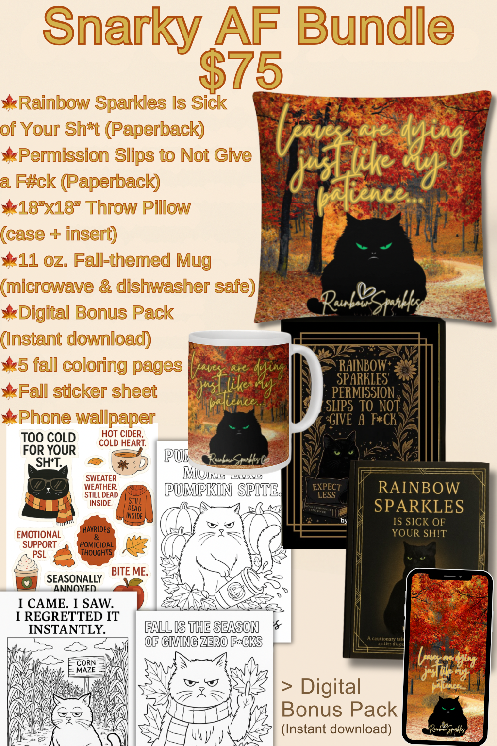 🍎Snarky AF Deluxe Bundle Rainbow Sparkles Fall Mug + Pillow + 2 Books + Digital Chaos – $75